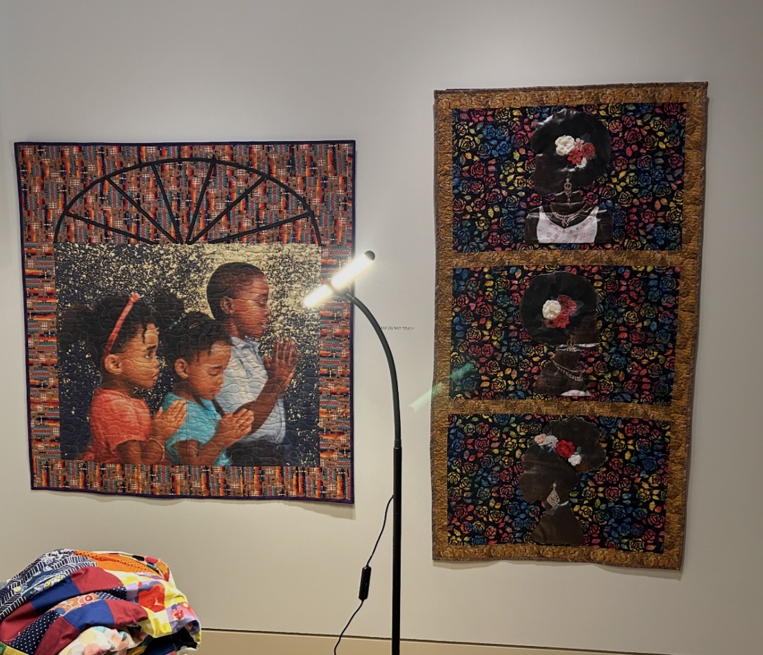 The exhibition features works spanning decades — from earliest quilts of 2004 to deeply personal pieces created during therapy sessions, each one a chapter in a story of healing, faith, and becoming.